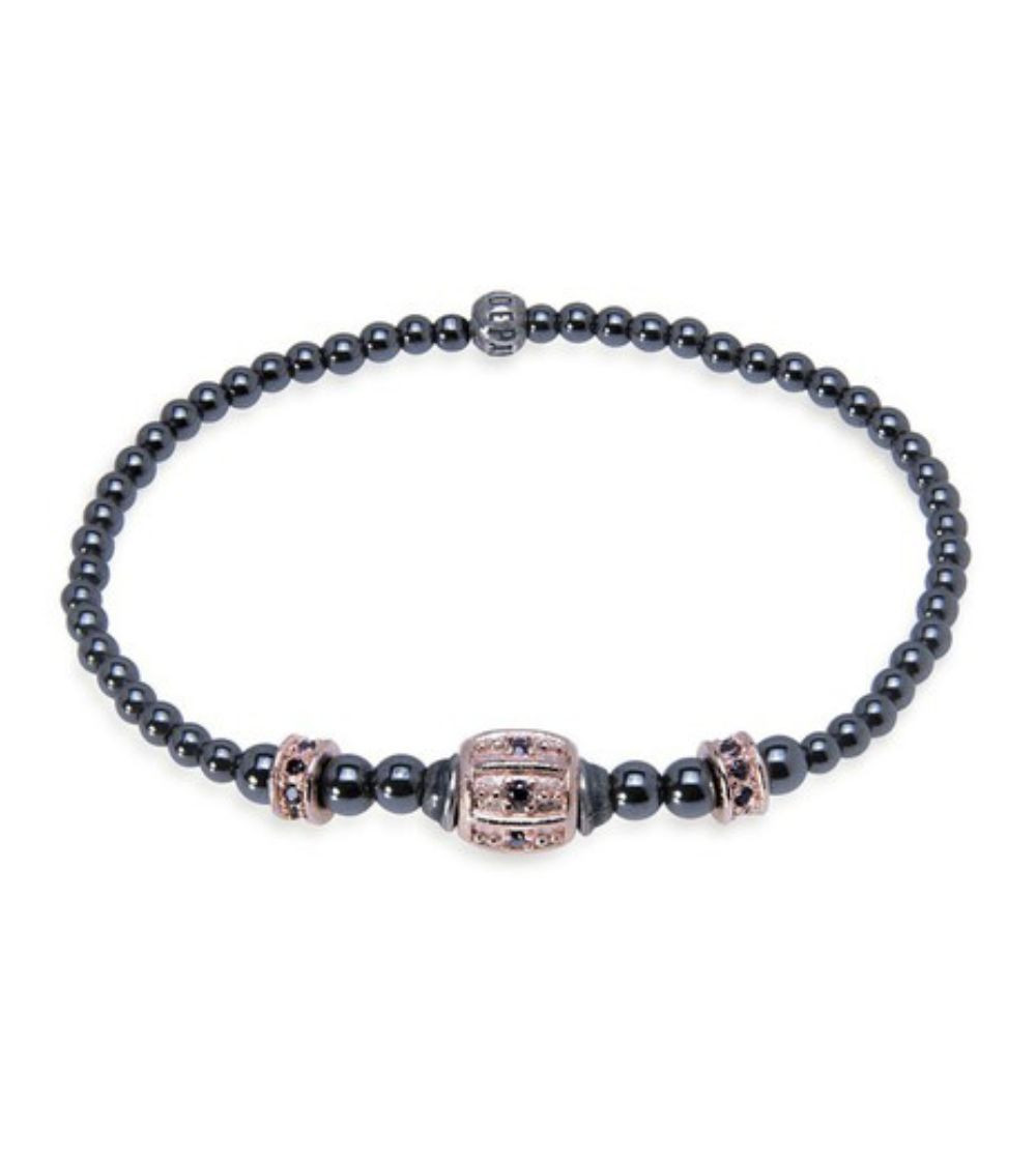 Elegante pulsera PLATADEPALO elaborada en hematite gris y una pieza barril central en bronce chapados en oro. Realizada de manera artesanal en España en bronce, sin cierre, ya que es elástica, con circonitas marrones y piezas de plata, con el logo de la marca. Talla M- para otras tallas, por favor consultar.