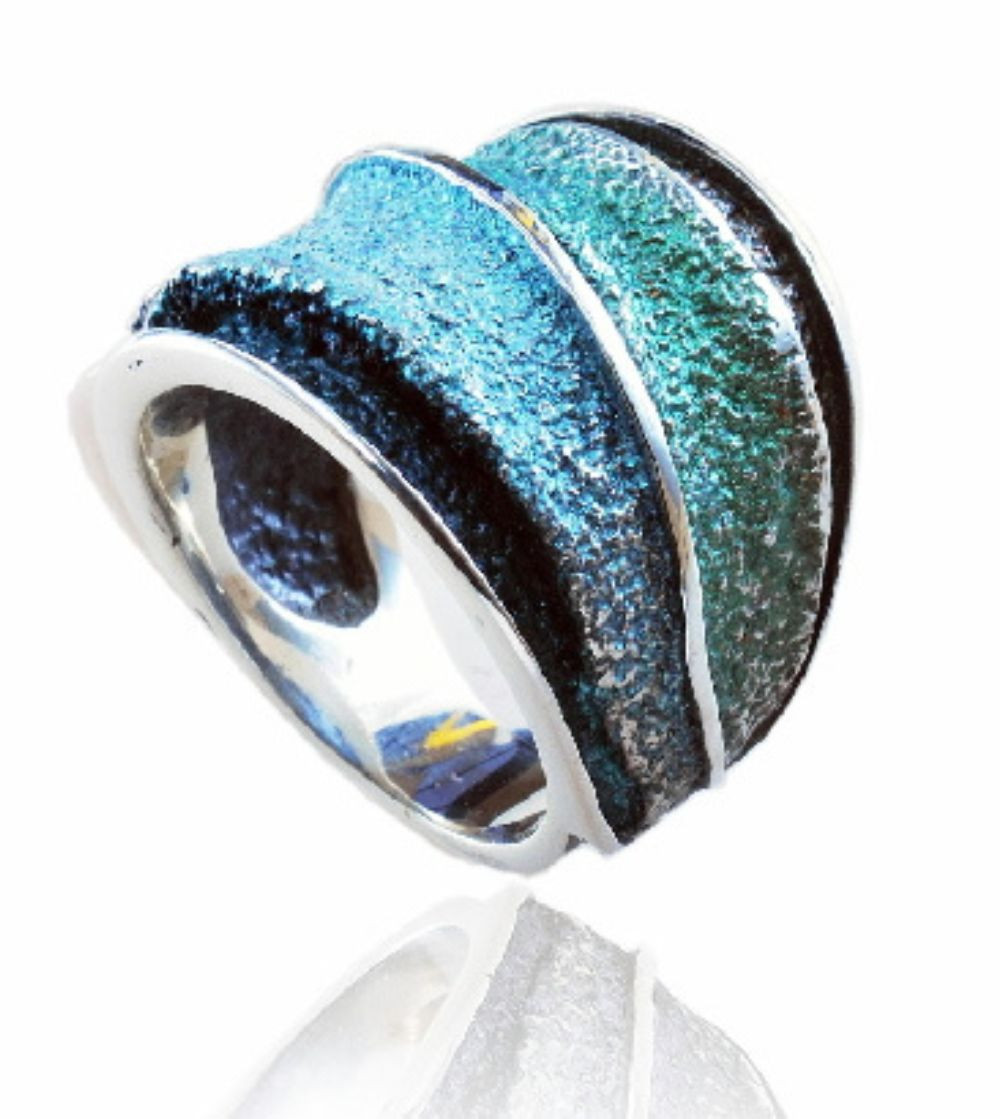 Sortija plata ancha colección Troia en esmalte al ácido color verde esmeralda.