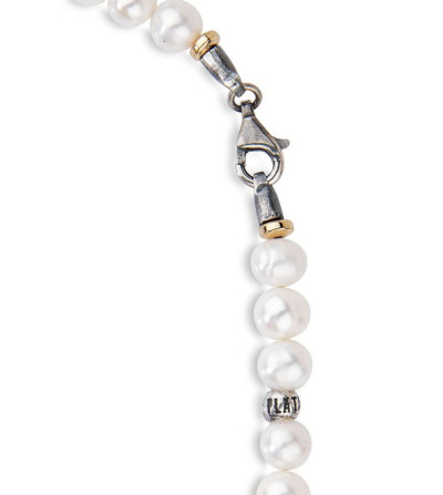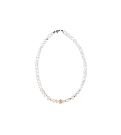 Collar de perlas de la nueva colección de PLATADEPALO realizado artesanalmente en España. Realizado en perlas de agua y circonitas blancas hacen de este collar un complemento especial para cualquier ocasión. Perlas de agua y hematíes dorados, con una pieza central de bronce chapado en oro amarillo y circonitas blancas. Lleva además bolas de plata 925 identificativa de la marca y cierre de plata. Largura del collar 42cms.